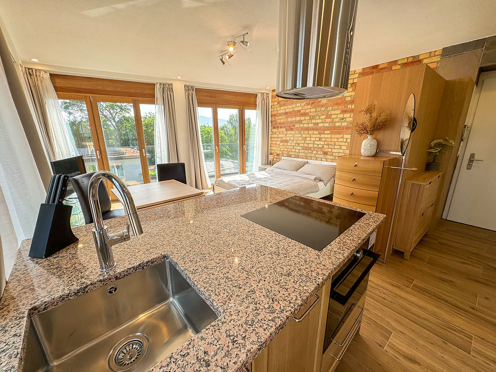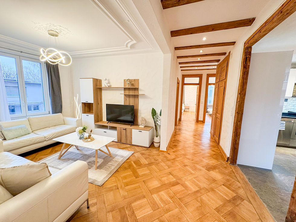 3 ½ room condominium on the 4th floor of the patrician house from the 19th century - freshly renovated and furnished - living / dining room with fireplace / TV / Internet - 2 bedrooms with 1 balcony - 2 bathrooms - living space 90m² - parking space available - complete furnished including bed and bath linen and kitchen equipment - underfloor heating / air conditioning - very sunny - a total of 5 washing towers on the individual floors are available free of charge to the house residents, as well as a cleaning service for weekly cleaning of the apartment is available on request. - Lift available.